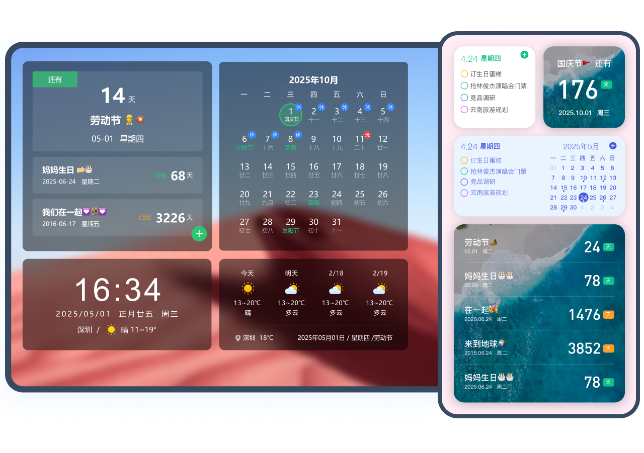 • 集成倒數紀念日、時間天氣等豐富組件
